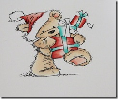 Now for the Hat and Presents using R08 colour around the edges of the present and James Hat – picture 1, using the same method as for the fur now add R02 – picture 2, and finally add R000 – picture 3.