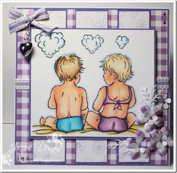 I have used one of Sheena Douglass Stamps Sets “Just the Two of Us” available on the website, and the delicious papers are from the Humphreys Corner Twin CD Rom, wow the papers on this CD are fabulous and will be used a lot. The Flowers have been punched with Medium and Small Retro Flower Punch with self adhesive pearls in the centre. The lush Heart Charm is from The Ribbon Girl.