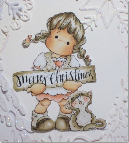 I have used one of my new Tilda stamps again, that cat just makes me laugh so much. Once again I have used my favourite Christmas tree dies from Dees Distinctively Dies - Christmas Stacker Trees, and another old favourite Doo-Hickey Vintage Swirl Die , I have also used The memory Box Frosty Border Die, a Doo Hickey Tag and finally Marianne Dies Snowflake. Lots of Glamour dust has been added to the Tress and Snowflake using A quickie glue pen.